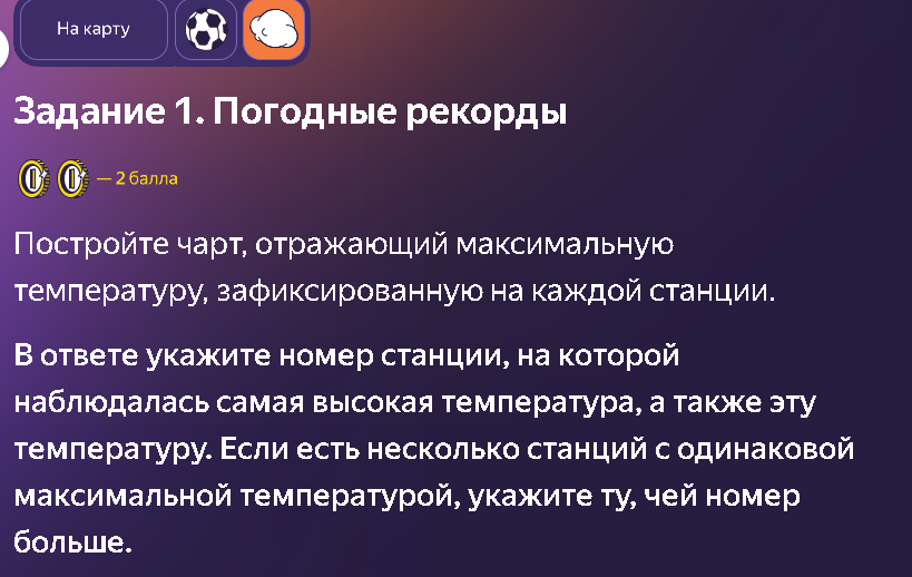 Постройте чарт, отражающий максимальную температуру, зафиксированную на каждой станции. В ответе укажите номер станции, на которой наблюдалась самая высокая температура, а также эту температуру. Если есть несколько станций с одинаковой максимальной температурой, укажите ту, чей номер больше. Ответы на весь тур у меня в телеграмме: https://t.me/yu_otvet