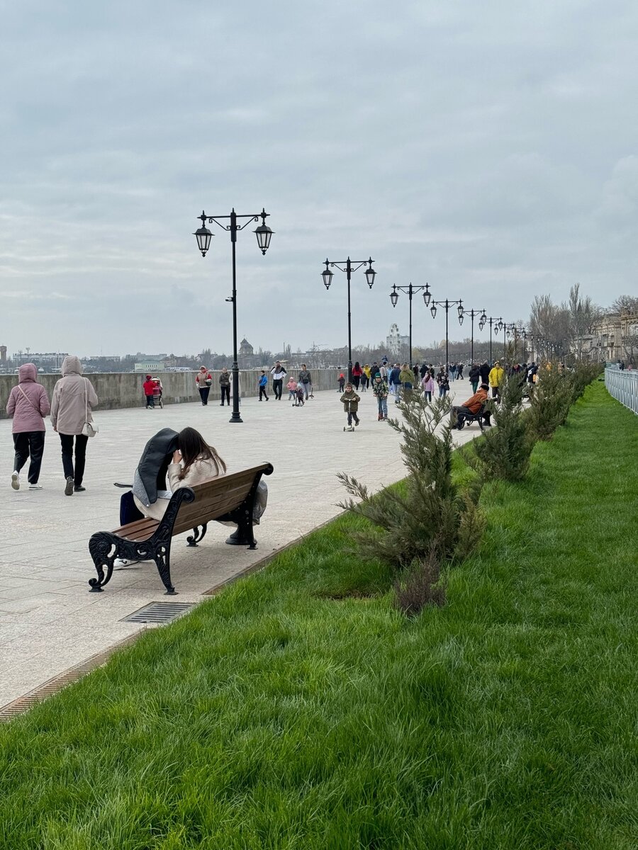 Народ просто курсировал туда-сюда вдоль береговой линии. Кто-то сидел у моря на вновь подсыпанном галечном пляже. Кто-то катался на роликах и самокатах по ровной поверхности набережной. Несколько детских площадок были битком забиты детьми и родителями. Играли уличные музыканты.