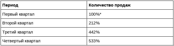 *В данной таблице количество продаж в первом квартале 2023 года берется за 100%, далее данные по каждому кварталу сравниваются с первым.