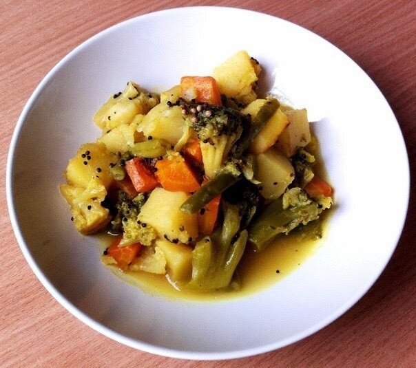 Ингредиенты: 2 средние моркови (нарезанные кружочками) 1 средняя кабачок (нарезанный кубиками) 1 средний картофель (нарезанный кубиками) 1 небольшая луковица (нарезанная) 2 помидора (измельченные) 1 зеленый перец (измельченный) 1 столовая ложка масла (для жарки) 1 чайная ложка тертого имбиря 1 чайная ложка тертого чеснока 1 чайная ложка куркумы 1 чайная ложка кумина 1 чайная ложка гарам масала Соль по вкусу Инструкции: