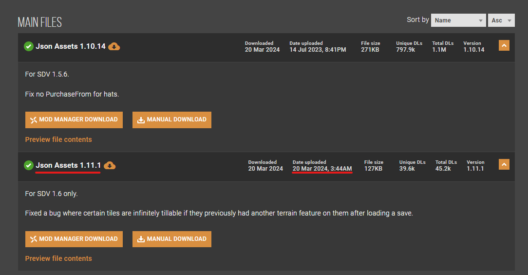 Важно: На момент выхода этой статьи (21.03.2024) во вкладке ручного скачивания модов нужно выбирать версию для Stardew Valley 1.6, она находится ниже версии для 1.5.5. Также советую обращать внимание на дату загрузки файла. Чем ближе она к текущей дате, тем "Свежее" мод.