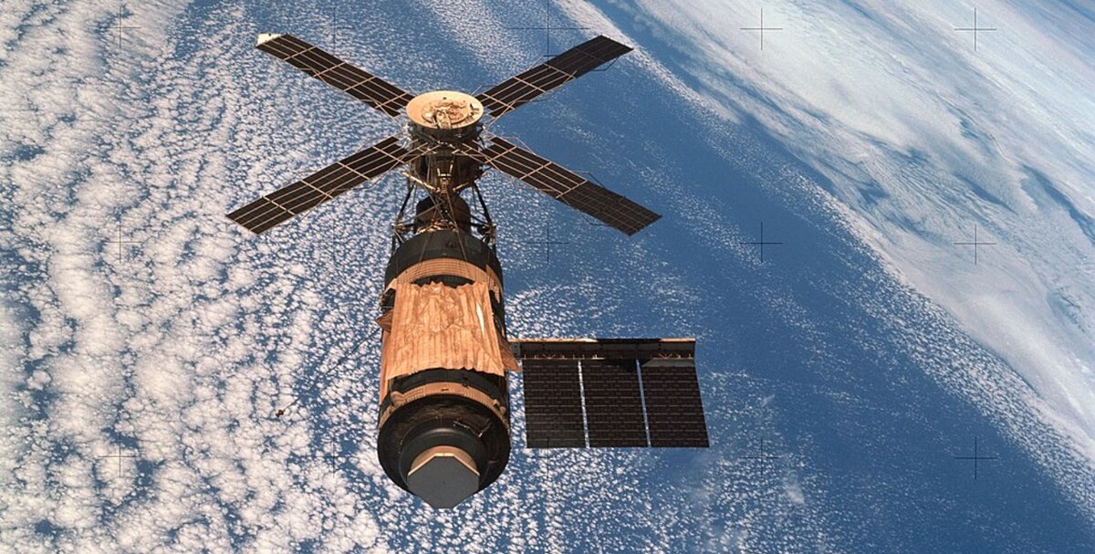 Запуск состоялся 14.05.1973 года. Характеристики: масса 77 т, длина:24,6 м, диаметр: 6,6 м. Высота орбиты 435 км. Электропитание от 6 солнечных панелей. Скайлэб была построена на основе корпуса верхней ступени ракеты Сатурн-1Б. За счет большого диаметра и длины станция казалась огромной, внутри было просторно.