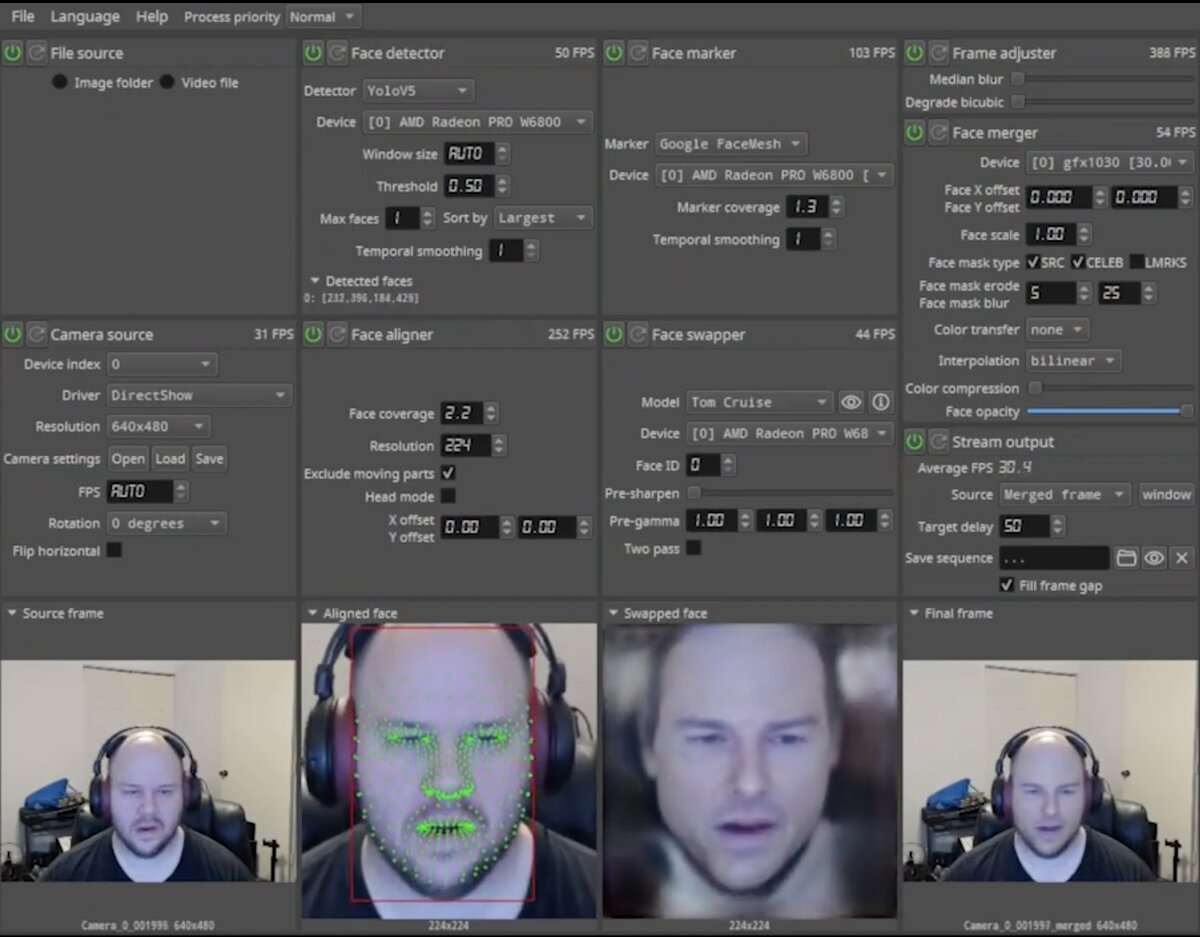 История от лица рассказчика. Мой хороший друг прошел курсы по фронтенд-разработке в Яндекс Практикуме. Однако, из-за отсутствия опыта и навыков самопрезентации, он не мог найти работу в течение трех месяцев. Я решил помочь ему, понимая, что ему нужна поддержка. Первым шагом было составление продающего резюме. Я не буду вдаваться в подробности, но отмечу, что я использовал LinkedIn для изучения анкет людей, работающих в крупных компаниях, и взял оттуда несколько впечатляющих пунктов. Также я нашел несколько компаний в одной доменной области и добавил к каждой из них минимум 2,5 года опыта. Для замены лица мы использовали программу DeepFaceLive. Она захватывает видеопоток и заменяет лицо с задержкой в 500 миллисекунд. Это требует значительных вычислительных мощностей. Для обучения модели лица моего друга я использовал свою старую видеокарту RTX 3070, которая позволяла достичь разрешения 448x448. Я хотел, чтобы модель имела максимальное разрешение 512х512, поэтому я решил приобрести более