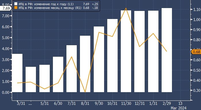Пауза в действиях ЦБР по ставке - по-прежнему базовый сценарий в марте - Альфа-банк "Росстат сообщил об инфляции на уровне 0,06% н/н за неделю с 12 по 18 марта или 7,58% г/г. С начала месяца инфляция составила 0,11% по состоянию на 18 марта, что согласуется с нашем прогнозом в 0,3% м/м за март. Текущий инфляционный ландшафт позитивен накануне заседания ЦБ РФ по ключевой ставке (пятница, 22 марта), и поэтому мы по-прежнему считаем паузу нашим базовым сценарием", - пишут аналитики Альфа-банка.