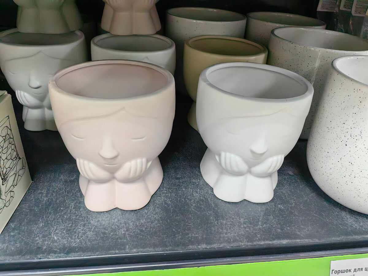 Это второй горшочек для цветка, светло-серый, появятся еще потемнее. И на витрине заставлен песочного оттенка, не вытащить, рядом нет свободного места.