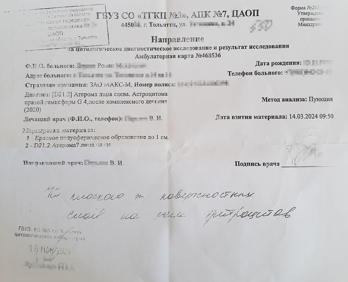 Результат цитологического исследования 👇 - Мало что из написанного мы поняли, но врач, сдвинув брови, сказал следующее: "Онкология у вас, Роман, не обнаружена". Стало быть биоматериал, взятый при помощи пункции, был не чем иным, как скоплением клеток атеромы. Это хорошо. Теперь ждём результат гистологии. - Отёк не сошёл, нижнее веко и пространство вокруг "места изъятия атеромы" еще припухшее. Рома чувствует себя удовлетворительно, слабости и головокружения нет. Готовимся к недолгой разлуке, строим краткосрочные планы. На пасху, помимо авторских куличей и яиц, Рома заказал мне пельмени из свино-говяжьего фарша! 👍