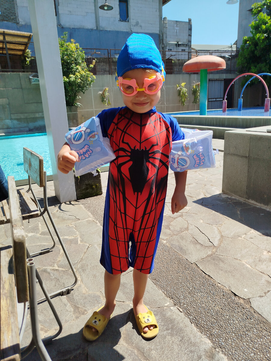 После недели холодов и дождей (+25°С, а то и +24 днëм, каждый день дожди почти без перерыва) в воскресенье 17-го марта снова потеплело (+28 - +30°С, солнечно), и в четверг мы пошли в бассейн. Амира обновила нарукавники и шапочку. Кроме нас никого в бассейне не было, но нам всё равно включили горки! Я уже выкладывала ролик, где вода резко выливается сверху из большого вёдра, которое несколько минут наполняется. Амире очень понравилось съезжать с мокрых горок в воду. Я тоже прокатилась несколько раз, но меня снимать в эти моменты было некому. Так вдвоëм и плавали в обоих бассейнах полтора часа. В следующий раз возьмëм свой круг арбузиковой расцветки. Он большой, даже я влезу, хотя я умею плавать. А вот я в купальнике - селфи с десятого раза почти прилично получилось.