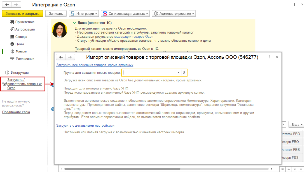 1С:Управление нашей фирмой. Загрузка товаров и отчетов из маркетплейса Ozon