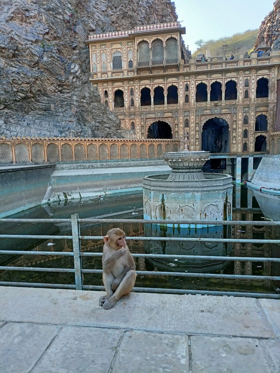 Дальше наше путешествие лежало в Джайпур. Из-за пробок ехать пришлось часов семь. И вот мы наконец, в розовом городе, точнее в его окрестностях. В 10 километрах от Джайпура находится интересное место-Обезьяний храм или Галтаджи. Это центр паломничества с несколькими храмами, развалинами древней крепости и источником святой воды. Здесь обитает множество обезьян, из-за чего он и получил такое название.