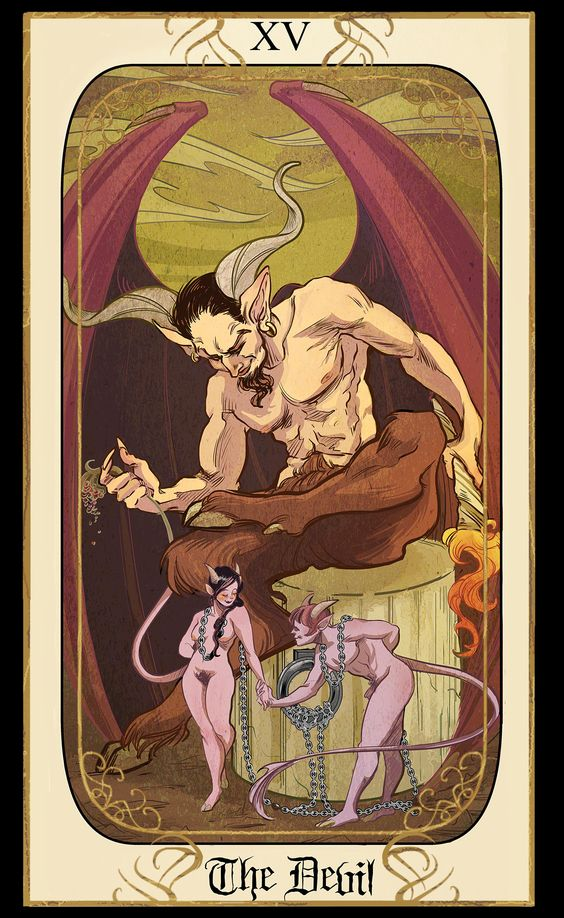 Дьявол также может указывать на соблазнительную искусительницу, часто представляемую в виде соблазнительной женщины или же манипулятивного мужчины, которые могут пытаться отвлечь нас от нашего истинного пути и нашей цели. Он может свидетельствовать о том, что мы позволяем кому-то или чему-то управлять нами, а не принимаем ответств