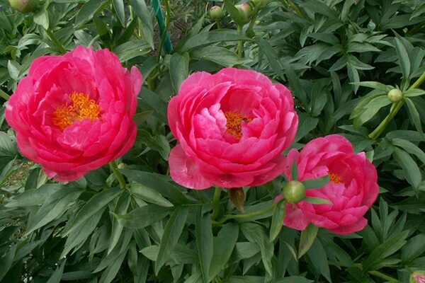 Лучше всего коралловые пионы смотрятся на фоне изумрудных газонов и низкорослых хвойных растений — туи, можжевельника и т.п.