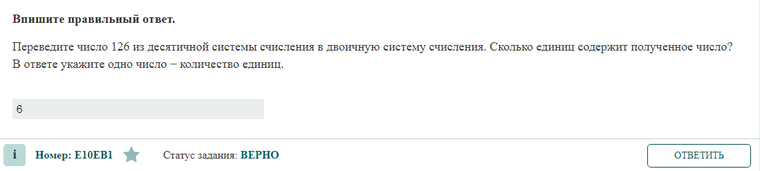 Переведите число 126 из десятичной системы счисления в двоичную систему счисления. Сколько единиц содержит полученное число? В ответе укажите одно число –– количество единиц. ЧТО НУЖНО ЗАПОМНИТЬ? Правила перевода из десятичной системы счисления в двоичную С помощью деления на два. 1. Последовательно выполнять деление исходного целого десятичного числа и получаемых целых частных на 2. 2. Записать полученные остатки в обратной последовательности. Пример: Переведем число 105 из десятичной системы счисления в двоичную: 105/2=52 (ост. 1) 52/2= 26 (ост. 0) 26/2=13 (ост. 0) 13/2= 6(ост. 1) 6/2= 3(ост. 0) 3/2 = 1(ост. 1) 1/2= 0 (ост. 1) Переписываем снизу вверх 105₁₀ = 1101001₂ РЕШЕНИЕ 126/2=63 (ост. 0) 63/2=31 (ост. 1) 31/2=15 (ост. 1) 15/2=7 (ост. 1) 7/2=3 (ост. 1) 3/2=1 (ост. 1) 1/2= 0 (ост. 1) Переписываем снизу вверх: 126₁₀ = 1111110₂ В ответ необходимо записать количество единиц в числе - 6. ОТВЕТ 6