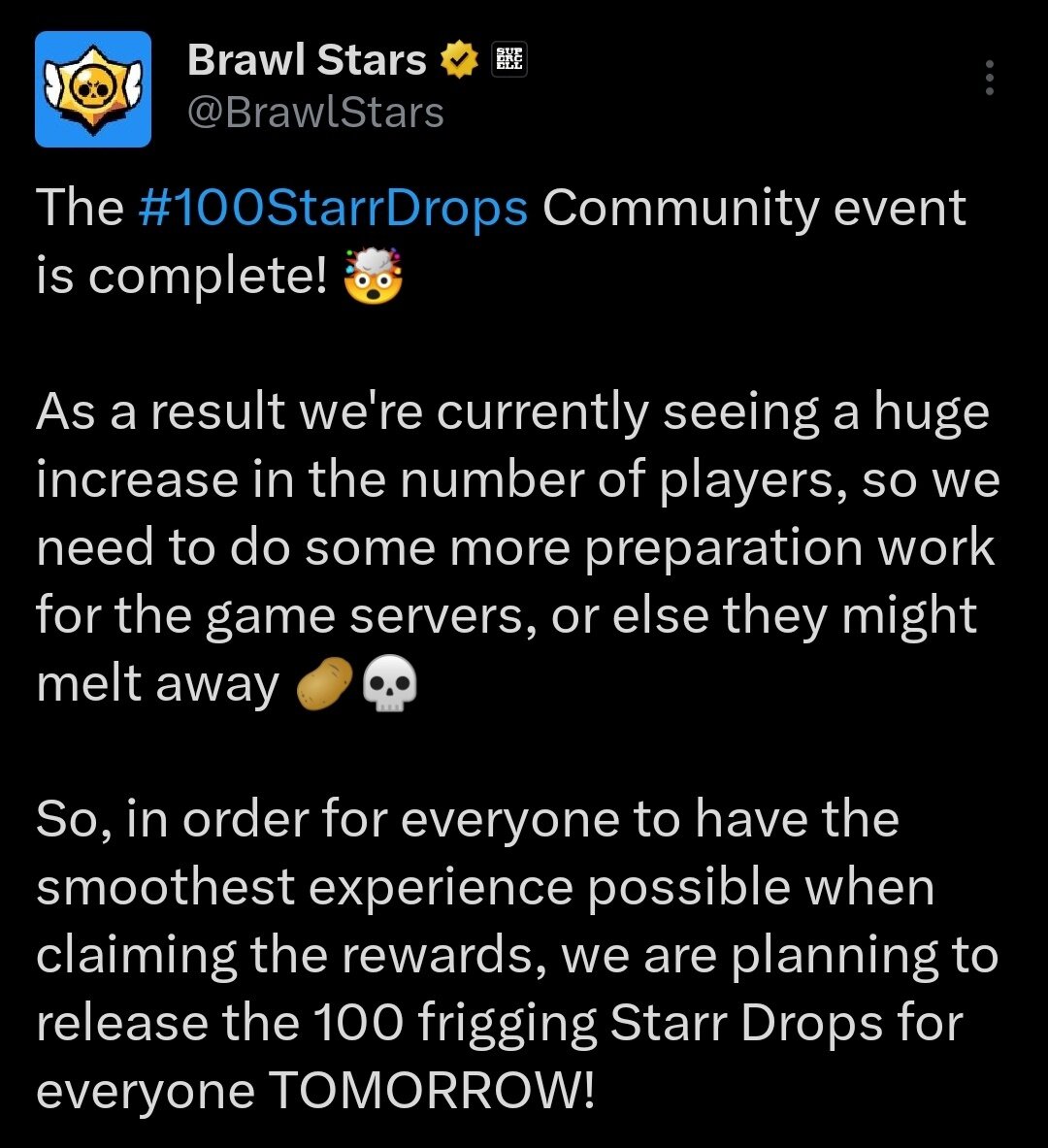 Сегодня мы ожидали 100 призов стар но.. Все пошло не по плану, мы заполнили 1.5 миллиарда редких призов стар, а разработчики в X (twitter) заявили о том, что ждать их нам надо будет до завтра поскольку они занимаются оптимизацией серверов