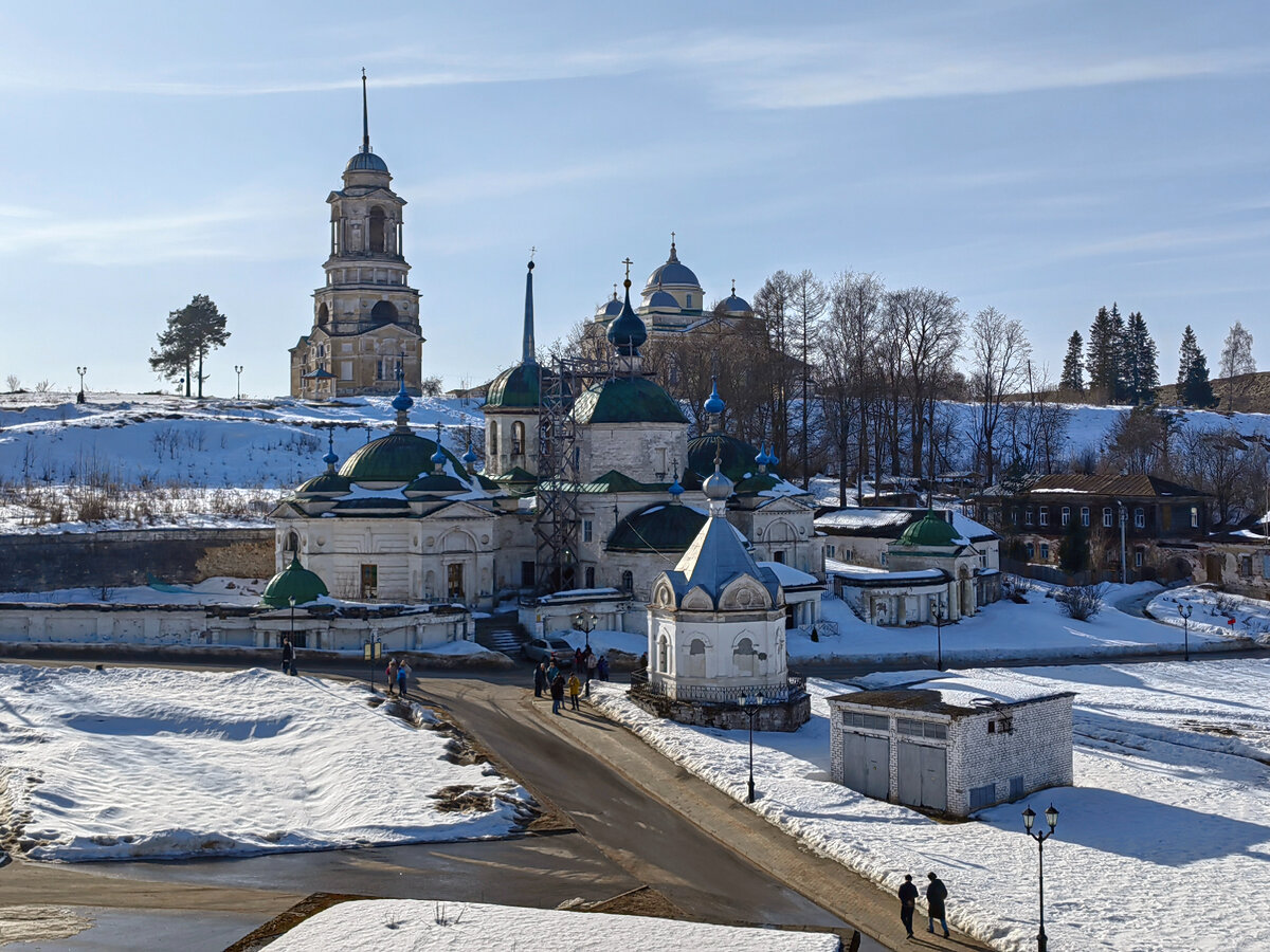 Архитектурный комплекс достраивался на протяжении 75 лет. В 1825 году местный старицкий архитектор М.А. Чернятин соединил здания церкви и колокольни трапезной, к которой пристроил церкви во имя великомученицы Параскевы Пятницы и преподобного Нила Столобенского.