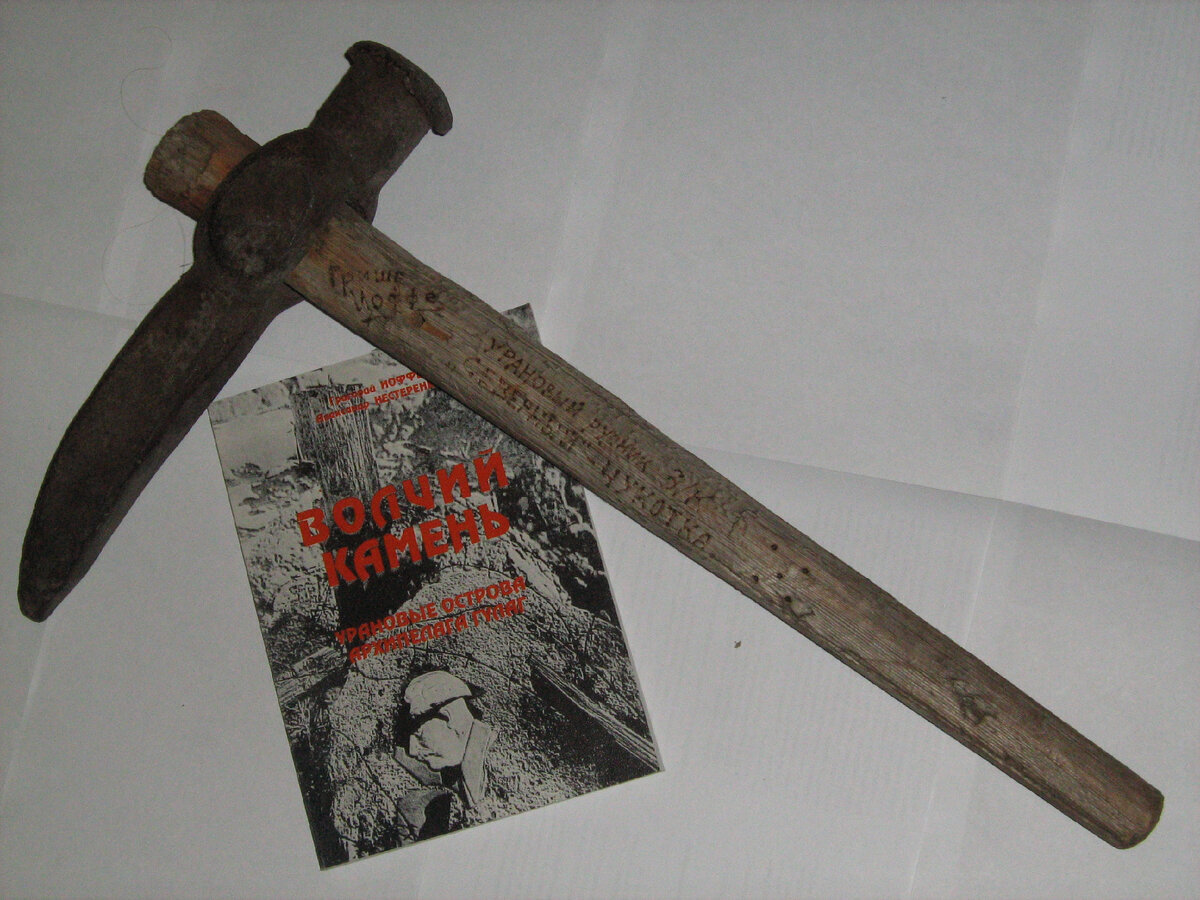 Григорий Иоффе Этот рабочий инструмент был, наверное, основным орудием производства на урановых рудниках Северный-Восточный на Чукотке, в 60 километрах от Певека, в 40-е - 50-е годы прошлого века. Нашел его и привез в Ленинград уже в 90-е фотокорреспондент районной газеты "Полярная звезда" Александр Нестеренко - вместе с серией фотографий из тех столь отдалённых мест. А потом в течение нескольких лет мы с ним собирали материалы для книги, искали (и находили!) людей, бывших заключенных, добывавших для первых советских атомных реакторов и атомных бомб урановую руду, И, наконец, в 1998 году издали книгу, которую вы видите на снимке вверху. А через полтора десятка лет случилось, по инициативе директора типографии ААНИИ Ильи Сергеевича Балагурова, второе издание, дополненное новыми материалами и большим количеством фотографий. Эту книгу сегодня может бесплатно прочитать каждый, кто заглянет в электронную библиотеку "Росатома". Что же касается кайла: сегодня, после долгих лет хранения в изда