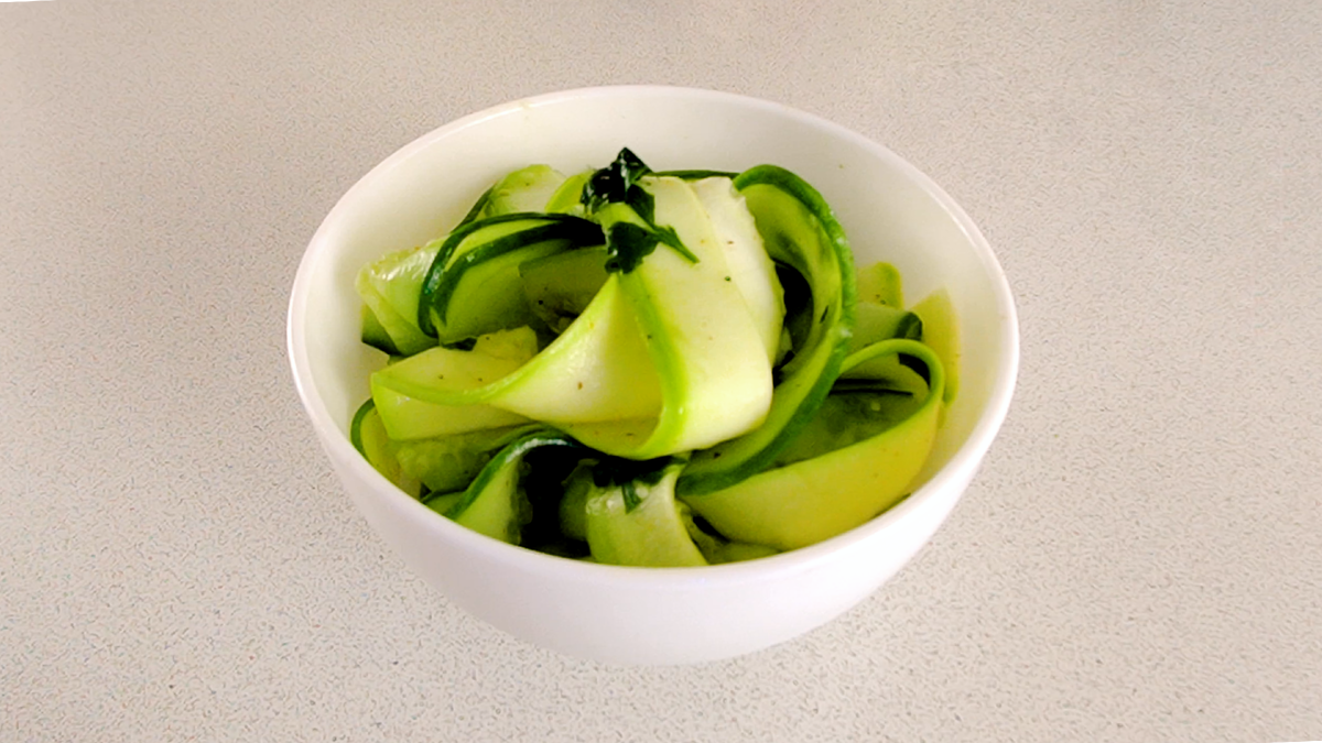 Можно приготовить вот такой красивый, необычный и вкусный салат из огурцов и кабачков. Он отлично подойдет для людей, придерживающихся принципов здорового питания. Ингредиенты: две трети гладкого огурца половина среднего кабачка или цукини 1/2 ч. л. соли черный перец молотый перец чили на кончике ножа 1 ст. л. лимонного или лаймового сока 1 ст. л. нарезанной свежей петрушки 2 ст. л. оливкового масла Способ приготовления: 1) Очистить половину кабачка от кожуры. Разрезать пополам вдоль. 2) Нарезать полоски из огурцов и кабачка с помощью специальной терки или картофелечистки. 3) Выложить в миску полоски из огурцов и кабачков. 4) Добавить соль, перец, молотый чили, лимонный сок, петрушку и оливковое масло. Перемешать Вкусный салат из огурцов и кабачков готов! Приятного аппетита. Большое спасибо что прочитали! ►►►Если понравился рецепт – поддержите нас лайком, подпишитесь на канал и напишите ваше мнение о рецепте,будем очень признательны! #необычныйсалат #необычныйсалатизогурцов #салатизогу