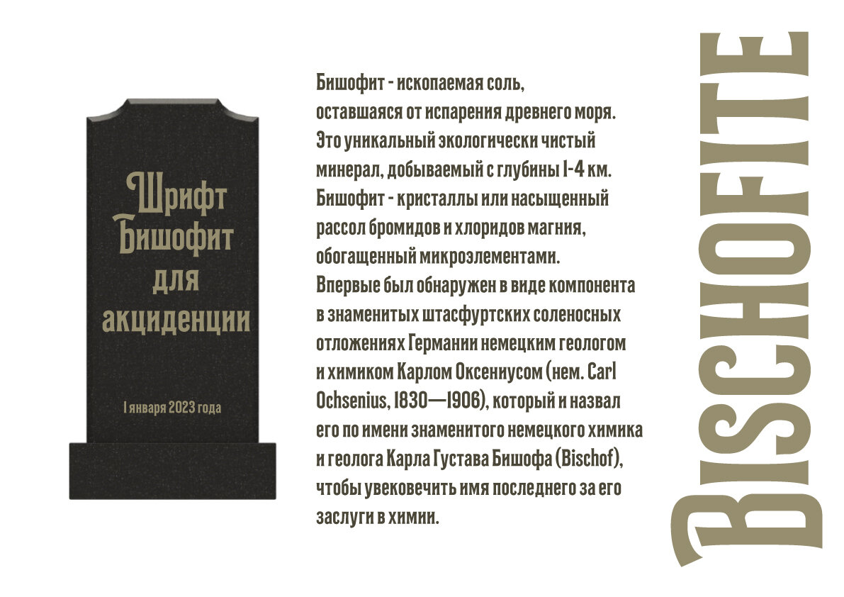 Bischofite - шрифт для памятников и книжных титулов. Традиционный акцидентный flare-serif с большим количеством свошей.