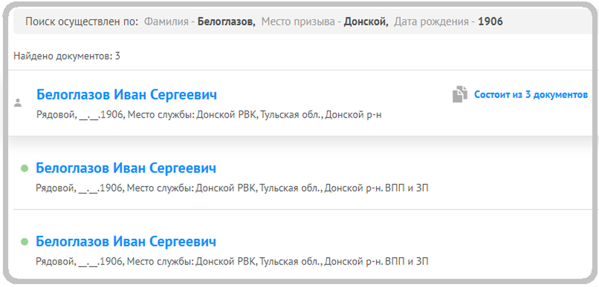 Мы искали Ивана Сергеевича Белоглазова. Информации о нём было совсем немного. Родился в 1906 году в Тульской области в деревне между Донским и Узловой. А точного места рождения не знали, и на сайте "Память народа" не было указано. В таком случае в архиве удобно смотреть консисторскую копию метрических книг. Там обычно в одном деле подшиты несколько церковных приходов за один год. Часто приходы сгруппированы по округам, т.е. сёла расположены рядом и на карте, и в архивном деле. Как раз то, что нужно. Ведь год и примерное место рождения были известны. Запись о рождении Ивана Сергеевича нашлась в приходе Казанской церкви села Каменки Епифанского уезда. Родители Ивана - крестьянин села Каменки Сергей Ильич Белоглазов и законная его жена Анна Романовна. Запись отлично сохранилась. Хорошо видны все строчки. И имена родителей, и восприемники. Замечательно! Теперь можно искать запись о бракосочетании родителей, а затем, где и когда они родились. Увлекательное путешествие в историю рода начинае