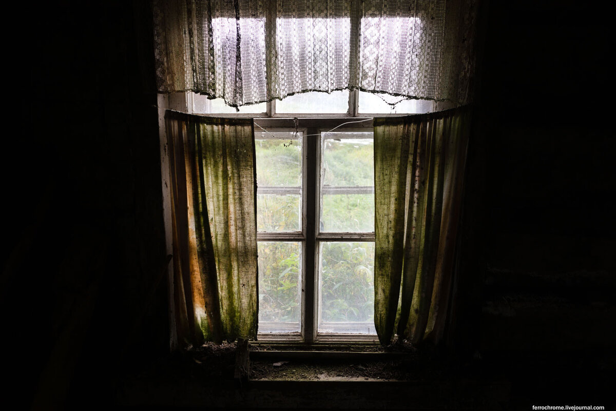 Приехав в одну довольно живую старинную деревню, мы обнаружили на её краю заброшенный дом. Пролезая ползком под грудами гнилых бревен рухнувшей хозяйственной части дома, добрались до двери. Заблокирована. Протиснувшись сквозь деревянные нагромождения в другую сторону, видим еще одну дверь. Закрыта на деревянное весло... Вытаскиваем весло, открываем и оказываемся внутри. Заправленная кровать, подушки горкой. А справа рухнувший потолок. Журналы, забытая на вешалке одежда. Выцветшие картинки. Старинные двери с латунными ручками. И самое главное - грибы. Крутое грибное образование на потолке. Грибы на диване. Этот уже просится в кастрюлю. Грибная власть здесь безраздельна. "Царские" двери прекрасны. Полотно у кровати во второй грибной комнате. Брошенная "Москва". В буфете макароны, чай, сахар. И старинная печь. Находится все это милое дело в необыкновенно красивом уголке природы. Где на срубленных, но так и неиспользованных бревнах растет лишайник. С такими дивными постройками в лесной глу