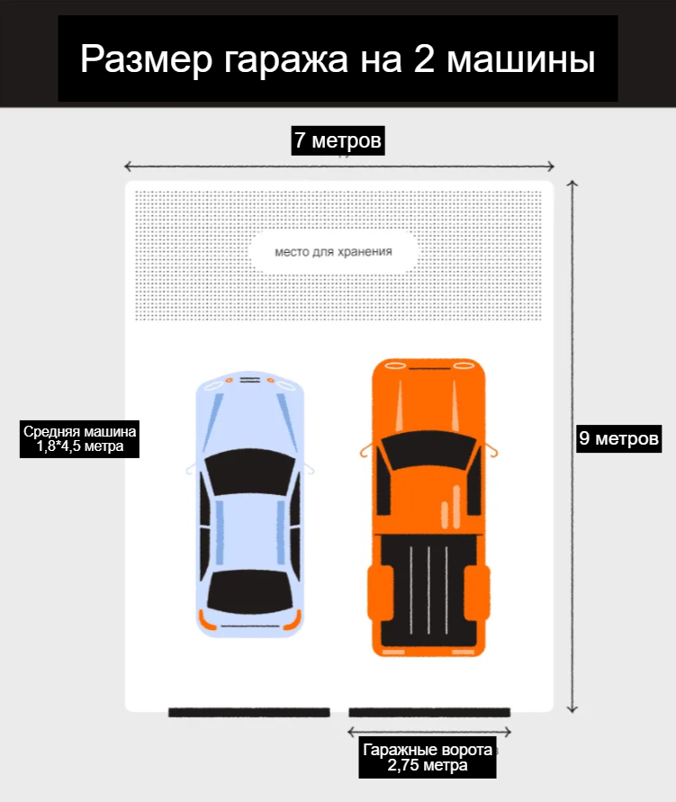 Гараж шириной 6,5 метров более удобен для двух автомобилей среднего размера, а гараж шириной 7,5 позволяет припарковать бок о бок два автомобиля большего размера. Эти автомобили могут поместиться в гараже глубиной 6 метров, но более глубокий гараж обеспечит достаточно места. Другие распространенные размеры включают 6 × 9, 7 × 7,5 и 7,5 × 9.
