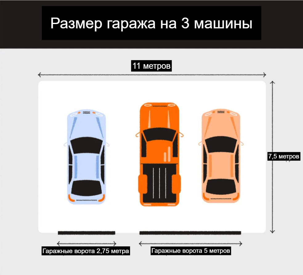 Стандартный размер для гаража на три машины составляет 9,75 метра в ширину и 6,5 метров в глубину (9,75 × 6,5), более идеальный размер - 11 × 7,5. Большие размеры создают дополнительное пространство для грузовых автомобилей или складских помещений. Другие популярные размеры отдельно стоящих гаражей на три машины включают 9,75 × 7,5, 10,5 × 7,5 и 11 ×8,5. Чтобы сократить расходы на данный конкретный размер гаража, установка трех гаражных ворот на боковой стороне вашего гаража обходится дешевле, чем установка дверей на передней (двускатной) стороне. Смотрите больше материалов по теме в нашей статье о гаражах и навесах на этой странице. Если вы планируете построить гараж, навес или хотите купить секционные ворота? Пишите в Телеграмм или WhatsApp