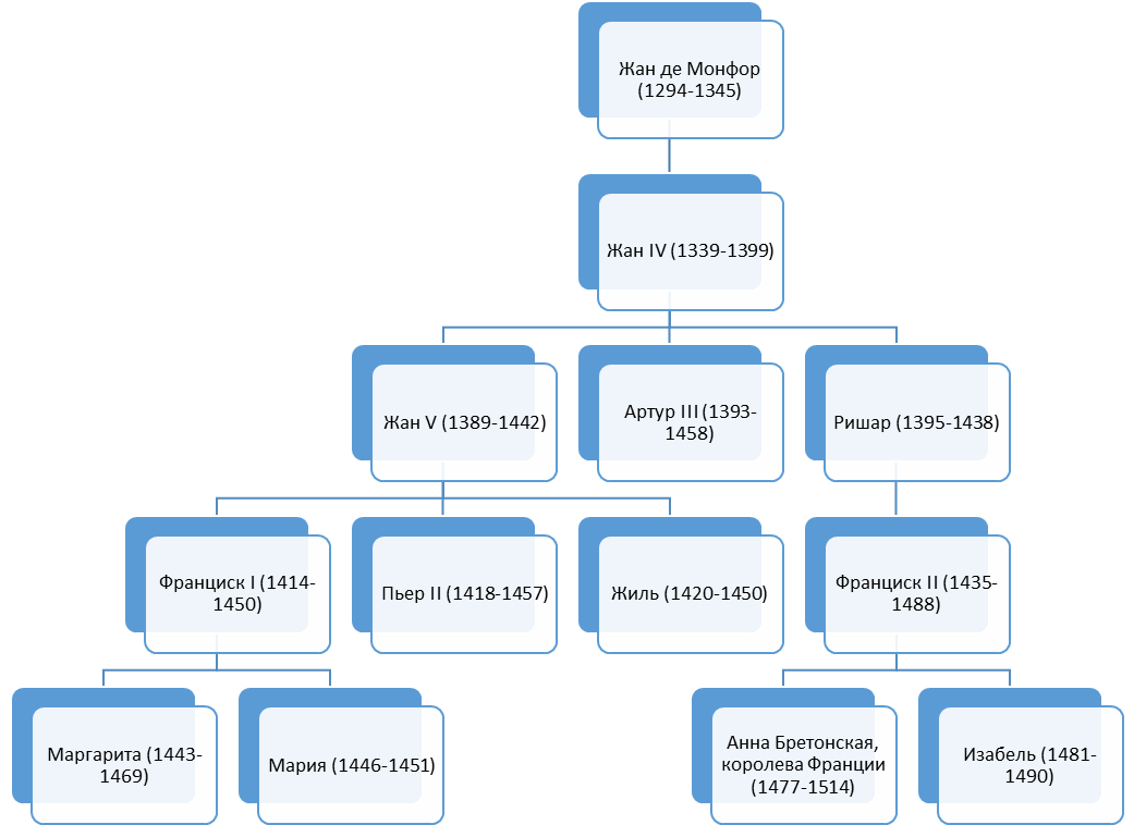 Итак, война за Бретонское наследство завершилась в 1365 году. За 20 лет до этого умер Жан де Монфор - напомню, этот титул, он получил от своей матери и позднее дом бретонских де Дрё называют иногда уже Монфорами (Второй дом Монфор л’Амори), несмотря на то, что всего лишь второй их титул, да и других де Дрё, если не считать Машекулей в Бретани уже нет. Еще одна неясность - в нашей историографии Жан считается полноправным герцогом с порядковым номером «Четвертый», а вот во французской – самопровозглашенным и потому, строго говоря, идет без порядкового номера, Жаном IV считается его сын, а внук того же имени, соответственно, Пятым (при составлении генеалогической схемы, как и далее в цикле этих статей, во избежание путаницы предпочитаю опираться на французскую аутентичную версию).