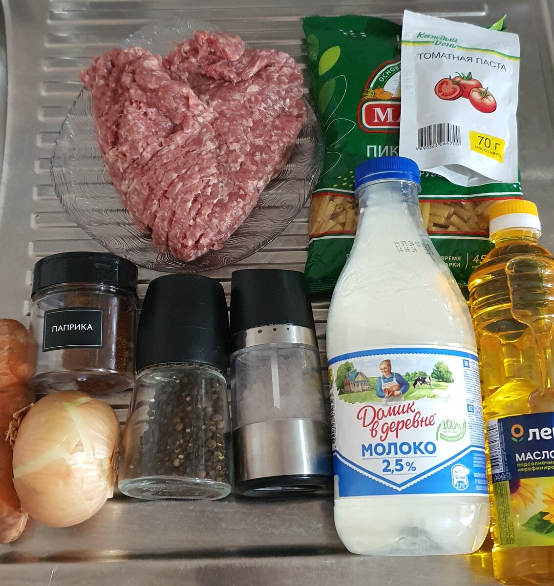 Это отличное сытное блюдо, которое прекрасно подойдет на ужин. Готовить его можно практически из любых макаронных изделий, дополняя овощами, рыбой, мясными продуктами. Фарш можно использовать любой. Сегодня я покажу на примере смешанного фарша - из свинины и говядины. Такой фарш в меру жирный и поэтому блюдо получится не только ароматным и нежным, но еще и сочным. Ингредиенты: - фарш 400 грамм ( у меня свино-говяжий) - макароны 200 грамм - лук 1 штука - морковь 1 штука - молоко 400 миллилитров - томатная паста 70 грамм - сыр твёрдый 150 грамм - соль, черный молотый перец и паприка молотая по вкусу - масло растительное 1-2 столовые ложки. Овощи помыть и очистить. Морковь натереть на крупной терке. Лук нарезать мелким кубиком. Сыр натереть на крупной терке. Обжарить овощи на хорошо разогретом растительном масле, постоянно помешивая, до легкой золотистости. Добавить фарш. Обжарить еще минут 7, постоянно перемешивая фарш и разбивая комочки. Добавить томатную пасту и специи. Пос
