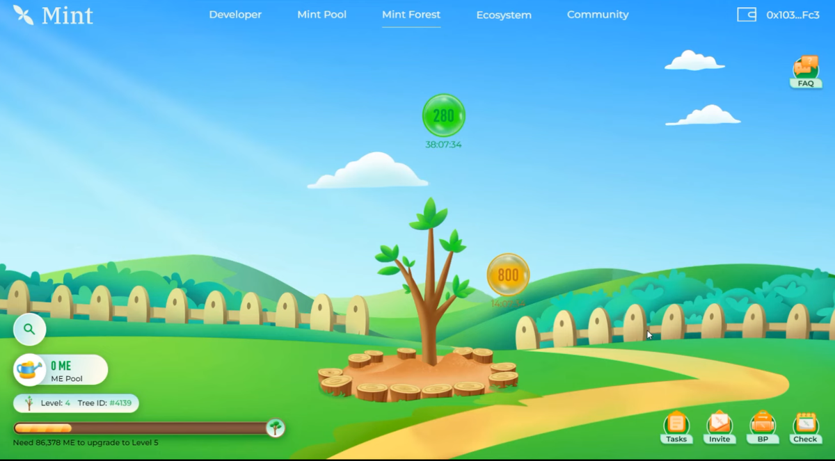 Недавно проект запустил ивент, в которым нам нужно фармить поинты ME и за эти поинты поливать дерево и таким образом выращивать-прокачивать его. После листинга во втором квартале уже этого года, проект собирается раздать свои токены MINT всем активным участникам. Которые приняли участие в ивенте, выращивали своё дерево и фармили поинты ME. Поэтому сейчас, мы можем выполнить абсолютно бесплатные активности, з
