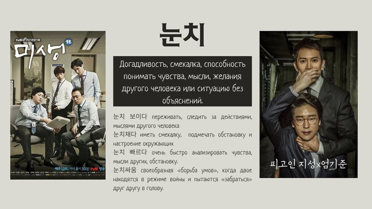 В каждом языке есть такие слова, которые очень «любят» переводчики за то, что перевести их одним словом на другой язык - крайне тяжелая задача. Меня зовут Ксюша, я веду канал daily쌤, преподаю корейский около трех лет и хочу поделиться с вами самыми основными «непереводимыми» корейскими словами, а также посоветовать фильмы и дорамы, посмотрев которые, вы сможете наглядно проследить их значения. 눈치 / Нунчи Пожалуй, самое «попсовое» корейское слово. Чаще всего, о «нунчи» нужно переживать на работе по отношению к коллегам и начальству. Например, когда берешь выходной в корейской компании, не бери его в пятницу, ведь все хотят взять его в пятницу. Так ты сможешь показать своё «нунчи» во всей красе. Поэтому дорама, которую я советую посмотреть - «Мисэн: Неполная жизнь» о стажёре, который устроился на работу в офис и пытается выживать. А второй рекомендацией будет дорама «Подсудимый», которая хорошо показывает такое понятие, как 눈치싸움 (перевод см. на фото) 정 / Чон Понятие, которое, к сожа