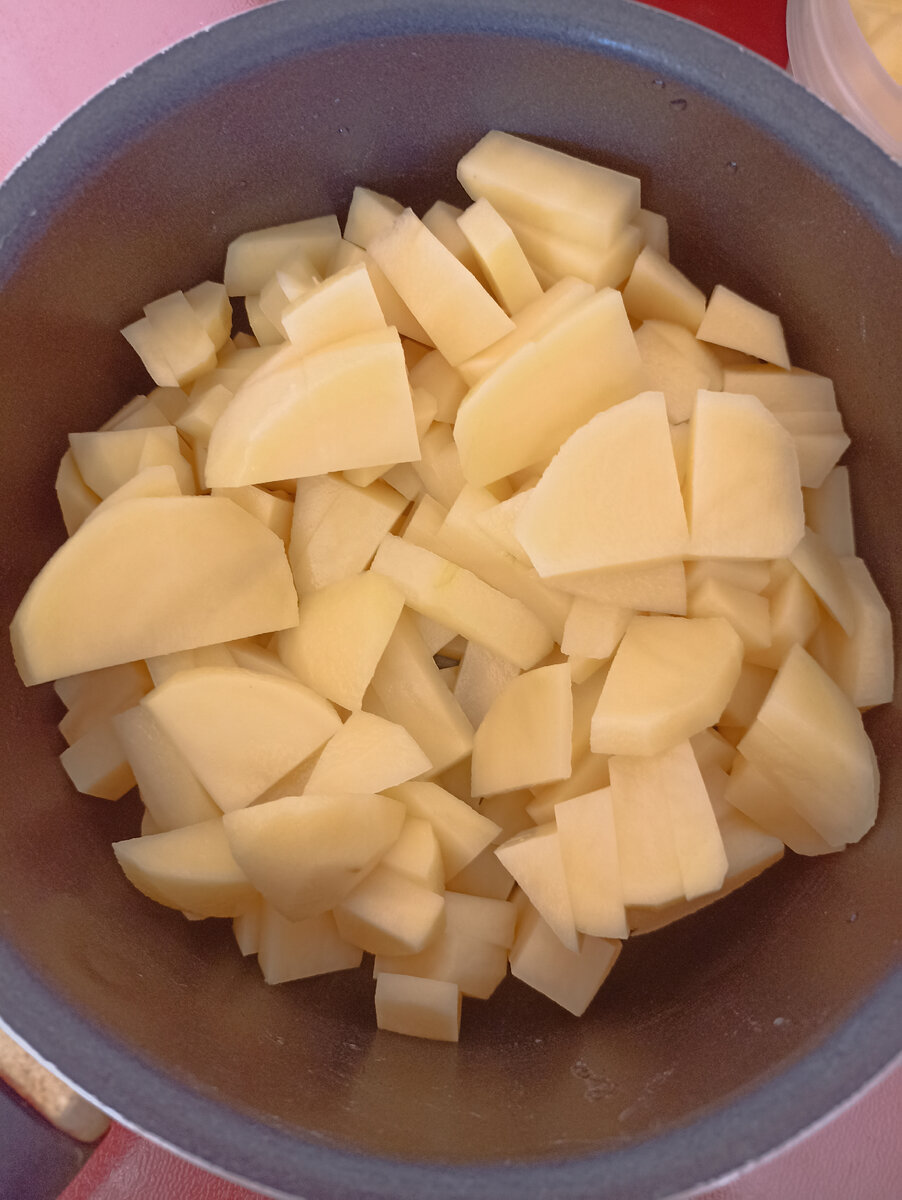 Чисти и режим картошку ,ставим отвариваться до готовности.