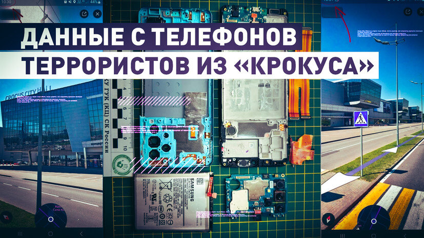 Следственный комитет России опубликовал видео с информацией из мобильных телефонов обвиняемых в совершении теракта в «Крокус Сити Холле». По результатам экспертизы были получены значимые для следствия данные об обстоятельствах подготовки к преступлению. По указанию куратора, утром 24 февраля 2024 года один из террористов нашёл на интернет-ресурсах и отправил ему скриншоты с изображениями входов в здание «Крокус Сити Холла» и подъездных путей к нему. Кроме того, в телефоне обнаружены фотографии людей в камуфляже с украинским флагом на фоне разрушенных домов и украинской почтовой марки с нецензурным жестом.