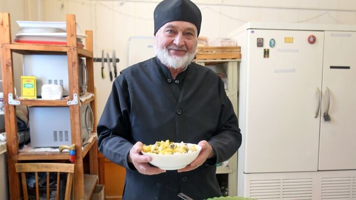 Послушнику Николаю Ткаченко 70 лет. Он профессиональный повар, в монастыре, где постоянно находятся 35 — 40 человек, живёт с 2015 года. А до того всё больше ходил по северным и южным морям.