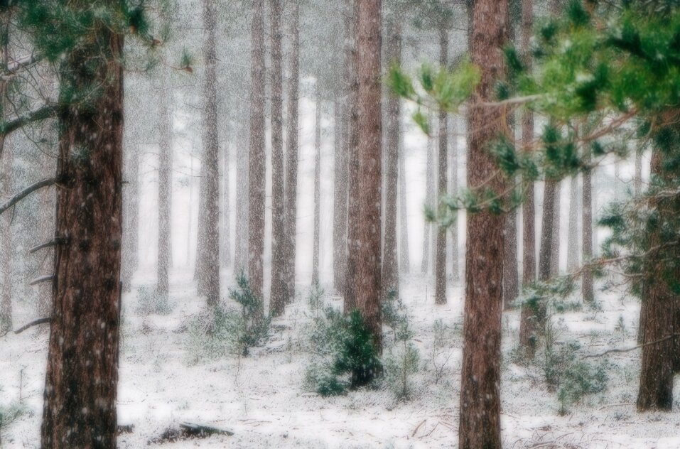 Вид за террасой открывался очень красивый и романтичный, сосновый лес, в котором мягко и беззвучно шёл пушистый снег, я поняла почему Надя с таким восторгом рассказывала про этот дом, вся красота была здесь, на втором этаже на этой террасе.