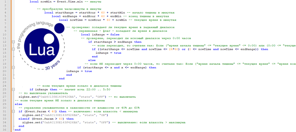 Так и в программировании: линейное исполнение кода не интересно почти никогда. В нашем шлюзе примером линейного скрипта может быть разве что только скрипт инициализации init.lua, который выполняется каждый раз при загрузке системы и служит для того, чтобы создать объекты, инициализировать таймеры или скажем включить сетевой лог (os.udplogenable(true)) или запустить синхронизацию времени (os.ntp()) - в общем выполнить все те действия, которые не сохраняются при перезагрузке.