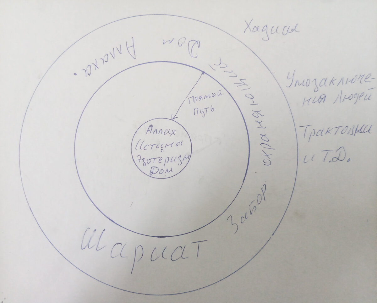 В прошлый раз, мы условно определили эзотеризм в исламе, точкой центре круга. Все что вне и вокруг неё это экзотеризм. Человек может быть ближе или дальше от Бога. Расстояние от его места вне точки, до центра, это и есть его прямой путь к Богу. Схематично это будет радиус. Неважно на каком расстоянии находится человек, он в любом случае имеет радиус. Если он ходит по кругу, то радиус не уменьшается. Если он ходит по спирали то радиус уменьшается, но при этом он идёт не прямым путём. Человек, находящийся вне Бога не имеет полной картины бытия, отсюда у каждого своя правда, отсюда множество религий и путей к Богу. Притом цель у всех одна, достичь состояния сознания Бога. Пока человек вне Бога, у него сильно развито ложное эго. Чем он ближе, тем больше стирается ложное эго. И чем дальше удаляется, его ложное эго растёт всё больше и больше. Когда всё ложное стирается, человек приходит как сознанию Божественной сути в себе. Он начинает осознавать «Ахад», единство Бога во всём. Именно к этом