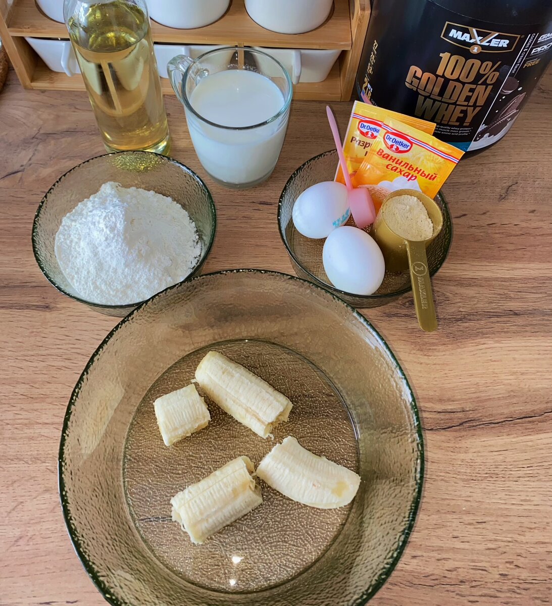 Банановые панкейки — отличное решение для вкусного и сытного завтрака, который готовится быстро из доступных ингредиентов и получается в меру сладким без большого количества сахара в составе. Банан выступает в качестве начинки и натурального подсластителя. Он помогает заменить всевозможные сладкие топинги, с которыми подаются традиционные панкейки. По желанию для спортсменов, можно добавлять Протеин. Ингредиенты Банан 1 шт. Мука рисовая 100 гр. Молоко 100 мл Сахар 1 ч. ложка (можно стевию) Яйцо 1 шт. Масло растительное 2 ч. Ложки Разрыхлитель 3-5 гр. Соль щепотка (по вкусу) Протеин 15 гр. (по желанию) Приготовление Разминаем банан вилкой. Делать это блендером не советую, банан буквально превращается в жидкость, а нам нужна густая масса. Добавляем к банану яйцо, молоко, сахар, соль и тщательно перемешиваем до объединения ингредиентов. Сделать это можно с помощью венчика или той же вилкой. Добавляем в миску муку, (протеин по вкусу), разрыхлитель и масло. Перемешиваем до однородности. Т