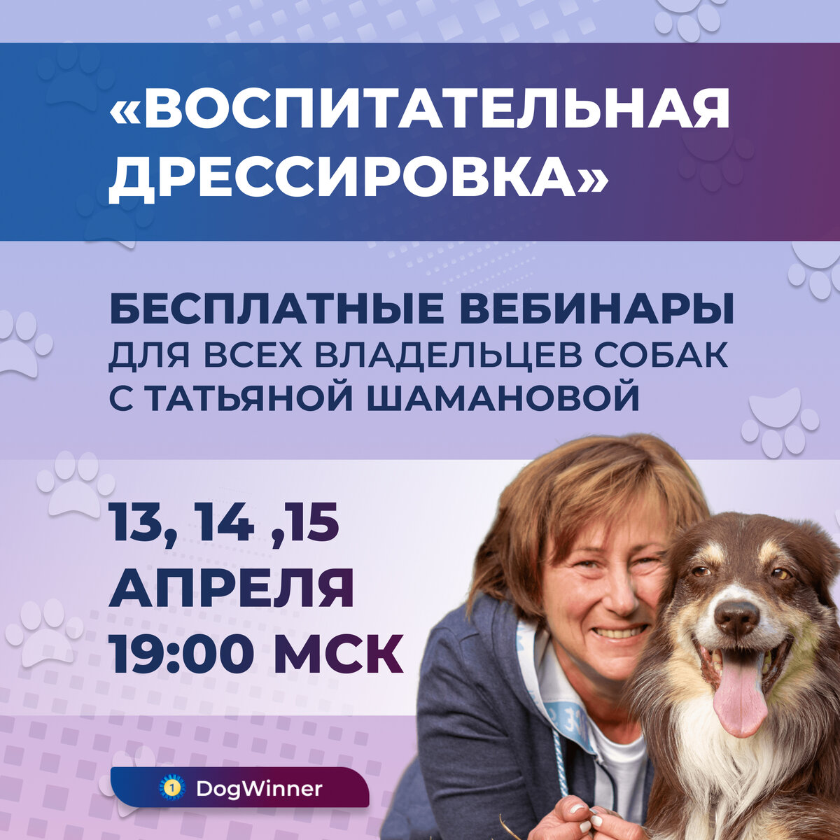 13, 14 и 15 апреля состоятся бесплатные вебинары инструктора по дрессировке Татьяны Шамановой для владельцев собак. Эта серия вебинаров проводится лишь 2 раза в год в поддержку старта большого практического онлайн-курса «Воспитательная дрессировка». Для регионов с разницей во времени будет доступна запись.