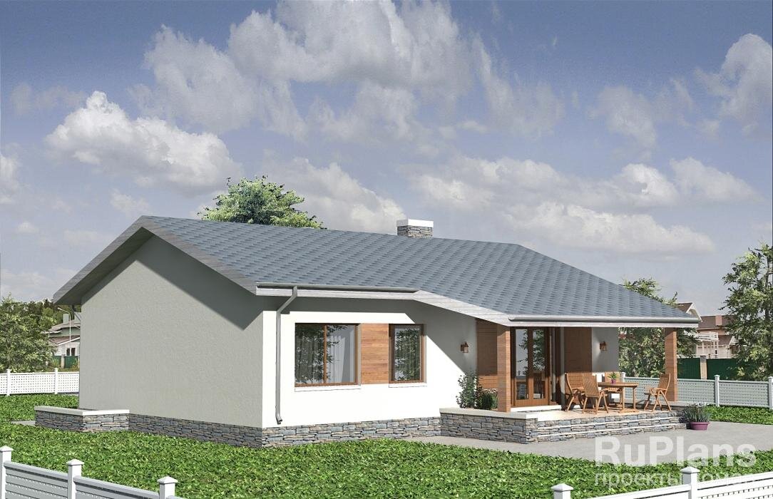 Одноэтажный дом с подвалом, террасой и тремя спальнями с размерами здания 13,13 х 14,51 м. Фундамент - ленточный из блоков ФБС под несущими стенами с подошвой. Фундамент террасы и крыльца - свайно-ростверковый буронабивной. Наружные стены – пароизоляционная мембрана, газобетонные блоки с утеплением пенополистиролом / оберешетка и отделкой штукатуркой / деревянными панелями. Внутренние стены – газобетонные блоки. Перегородки – газобетонные блоки. Пол 1 этажа и подвала - пол по грунту. Межэтажное перекрытие - монолитная ж/б плита. Чердачное перекрытие – деревянные балки с теплошумоизоляцией в межбалочном пространстве. Крыша двухскатная. Кровля – битумная черепица. Окна — металлопластиковые.