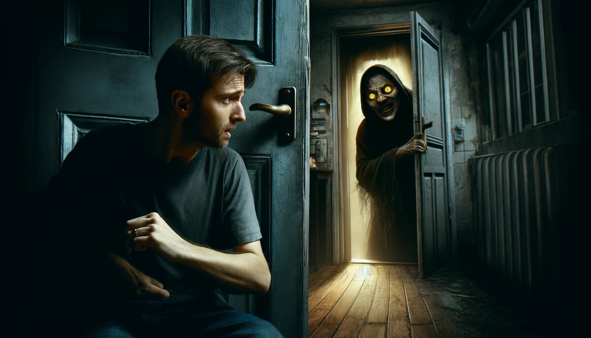 В старом здании на окраине города, где каждый шаг отзывался эхом в пустых коридорах, жил Артём. Его квартира была на последнем этаже, и окна выходили на бескрайний лес. Он всегда любил тишину и уединение, находя в них своеобразное убежище от внешнего мира. Но в последнее время он приобрёл странную привычку - заглядывать в дверной глазок. Каждый вечер, возвращаясь домой, Артём останавливался перед дверью и медленно подносил глаз к глазку. Он ожидал увидеть пустую, немного пыльную площадку, что всегда успокаивало его. Однако однажды, в одном из этих бесцельных взглядов, он увидел что-то неожиданное. За дверью стояло существо. Оно было не высоким, его контуры напоминали человеческие, но его лицо было искажено в уродливую маску. Жёлтые, как янтарь, глаза смотрели прямо на него, а широкий рот изогнут в неприродной гримасе. Артём оцепенел от ужаса, но не мог отвести взгляд. Он почувствовал странную привязанность к этому зловещему видению, почти как в стокгольмском синдроме. День за днём, не
