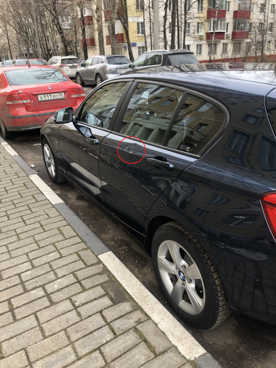 Вмятина на двери БМВ от удара неизвестно чем и кем.