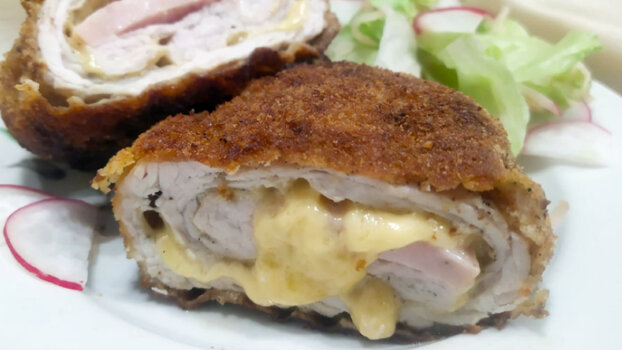 Шницель Кордон блю - праздничное блюдо, которое можно готовить каждый день! Ведь этот шницель готовится просто. В классическом рецепте используют телятину, но эта хрустящая котлета получается вкусной и сочной и из куриного филе, и из филе грудки индейки. С курицей блюдо получается бюджетное, а приготовление займет 20 минут активных действий и еще 20 - на приготовление в духовке! Рецепт Кордон Блю мы подсмотрели у шеф-повара Александра Бельковича. Шницель Кордон блю из индейки Понадобится: Филе грудки индейки – 3 шт.; Твердый сыр (можно с плесенью) 30 г; Полутвердый сыр 100 г; Ветчина – 100 г; Мука – несколько ложек; Яйцо – 1 шт.; Специи, соль и черный перец; Сливочное и растительное масло – для жарки; Батон (для приготовления панировочных сухарей) – 4-5 кусочков 1. Батон нарежьте кубиком, поставьте сушиться в духовку при температуре 200 градусов минут на 5, один раз перемешайте и досушите ещё несколько минут. 2. В это время филе индейки отбиваем кухонным молотком (удобнее филе положить