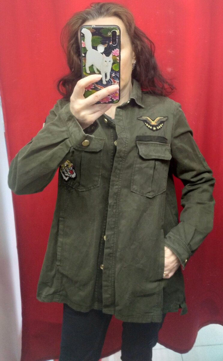 Здравствуйте, не впечатлила меня это распродажа, предыдущая была получше. Впереди будет акция, "всё по 100 рублей", жду ее и надеюсь)), что может повезет. А пока то что я посмотрела, но не купила. Рубашка из плотной ткани или лёгкая курточка, натуральное милитари с погончиками и карманами. С удобными карманами. И нашивками. Не очень симпатичный голубоглазый тигр. Решила померить юбки и забыла, что я без футболки, пришлось мерить прямо на толстый свитшот. Плиссированная юбка на широкой резинке. Есть подкладка примерно до коленей. Больше понравился рисунок, зелёный с оранжевым красиво смотрится. А что за ткань видно на фото, это полупрозрачный и тонкий полиэстер. Чёрная блузка с яркой вышивкой. На чёрном вышивка смотрится хорошо, но на жару для меня сомнительно. Хотя бедуины шляются по пустыням в черной одежде, возможно они лучше меня разбираются в физике)). Модель летящая с пышными рукавами, резинкой на талии и застежкой на спинке. Сарафан трехъярусный, резинка по верхней части и в ля