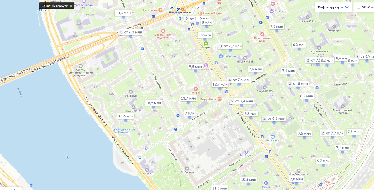 Посмотрим цены на двухкомнатные квартиры в объявлениях на Циане у метро Новочеркасская. Район хороший, через мост до центра, инфраструктура разнообразна и развита. Есть новая застройка со стороны офиса банка Санкт-Петербург, но мы сконцентрируемся на домах постарше: 60-х годов постройки. Состояние квартир разное. Есть убитый советский ремонт, но варианты в современной отделке тоже встречаются. Подписывайтесь на наш телеграм-канал о недвижимости https://t.me/treschevyestate