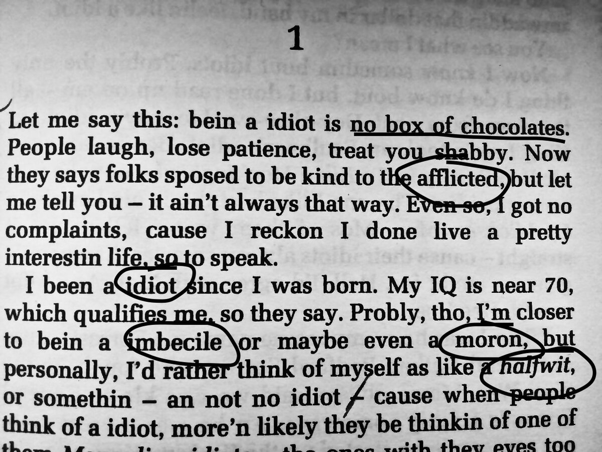 🔔 в контексте Глава первая - как раз отсюда фраза про то, что жизнь отнюдь не коробка шоколадных конфет. Повествование от лица человека с Синдромом Саванта, и поэтому в тексте буквы в словах отваливаются, из-за проблем с речью герою сложно правильно придавать звуковую форму словам, но не формулировать мысли. Выделим синонимы, которые автор использует для описания "не самого сообразительного человека" ⤵️ idiot/imbecile/ moron/ halfwit wit - в том числе умственные способности, вот и получается как бы половинка от ума afflicted - страдающий болезнью или даже юродивый slow - "тормоз" /медленный а bright имеет противоположный смысл - острого ума человек ⤵️ Что еще тут интересного, глянем ⤵️ treat you shabby - shabby может быть и потертый/захудалый и даже подлый, т.е. здесь "относиться прямо скажем не очень к человеку" I reckon - я думаю folks - в целом люди и родня.