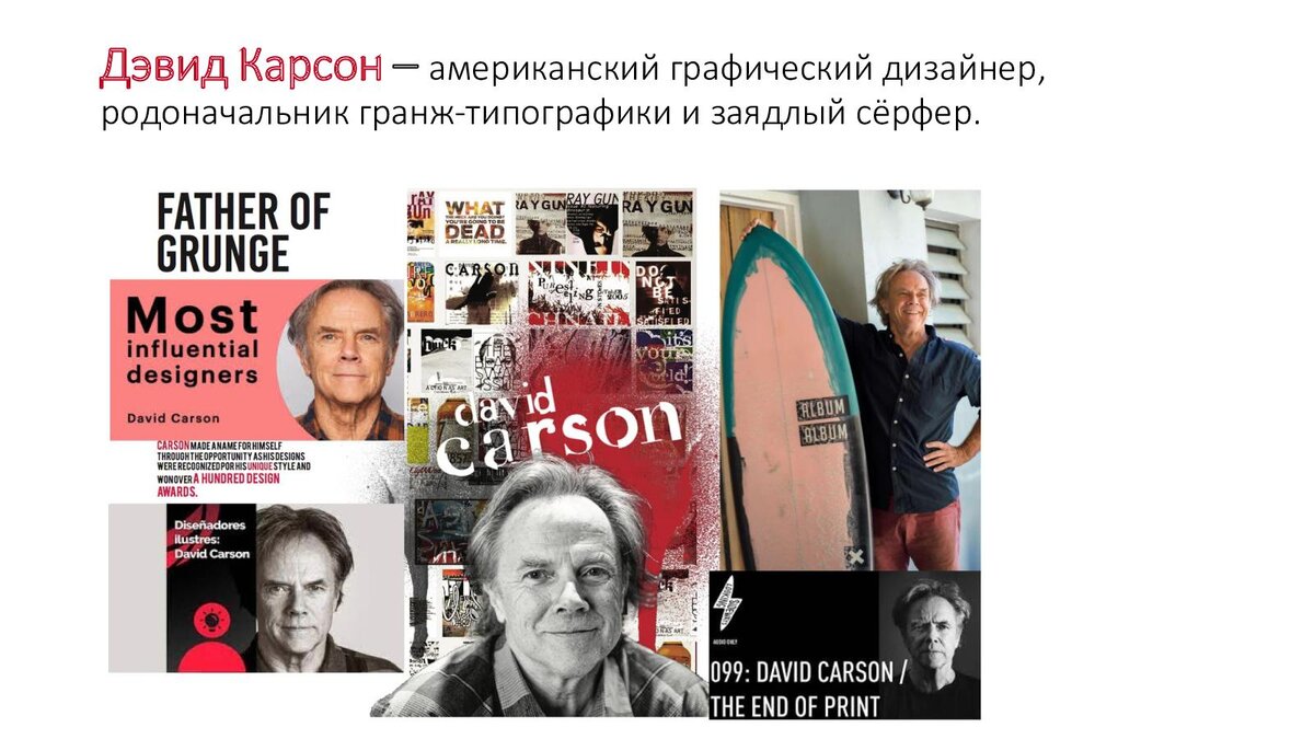 Сегодня познакомилась еще ближе с творчеством известного американского дизайнера Дэвида Карсона. И не могу не написать о нем в нашем комьюнити. Лично я ставлю его на одну ступень со Стефаном Загмайстером (в моем дизайнерском миропонимании это пик хаоса и свободы, но удивительно упорядоченный). Именно благодаря Карсону появилась гранж-типографика. Работа в одном только журнале «Beach Culture» принесла ему более пятидесяти наград в сфере графического дизайна. Он первым отказался от модульных сеток. И ладно бы это произошло с обычным плакатом, но нет! Он также призывал отказаться от этих «костылей», как он их называл, в журналах и книгах! Благодаря такому своему подходу мистер Карсон сделал журнал «Ray Gun» одним из самых культовых. Однако именно благодаря экспрессивности и визуальной сложности этих работ с Дэвидом все-таки предпочли расстаться. Но, тем не менее, этот факт не помешал творческому и профессиональному развитию графического дизайнера. Его студия "David Carson Design" забрала