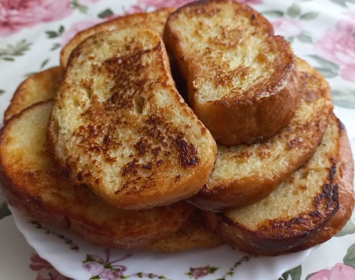 Сейчас ценность хлеба уже не та... Уже два поколения не знают, что такое голод. Питаемся мы вполне нормально. На столе практически в каждом доме есть и молоко, и масло, и мясо с рыбой, и не только... Можно сказать, что мы уже заелись. Почему так говорю, потому что вижу довольно часто, что оставшийся и порой заплесневелый хлеб выброшен в мусорный контейнер. Многие не научились покупать хлеба столько, сколько его нужно. А зачерствевший уже идет на выброс. Хотя его вполне можно пустить на сухарики, либо пожарить из него гренки. Вкусные, аппетитные с румяной корочкой они уйдкт с чаем только на "ура". Хочу поделиться с вами своим рецептом, как приготовить быстро и вкусно гренки. Готовится очень быстро, а получается бесподобно вкусно! Ингредиенты Как приготовить гренки с яйцами и с молоком. Пошаговый рецепт Шаг 1. В миске смешайте яйца с солью и сахаром до однородной консистенции. Шаг 2. Добавтьте молоко и ванилин для аромата, еще раз хорошо размешайте, чтобы сль, сахар и ванилин хорошо р