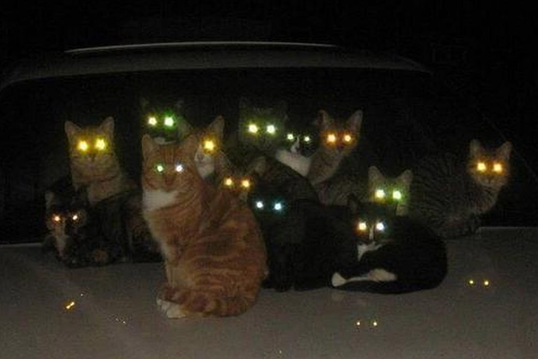Все знают, что кошачьи глаза светятся в темноте. Вернее, что они отражают свет. Поэтому любой направленный источник света в полуночной тьме превращает глаза котиков в адские фары.