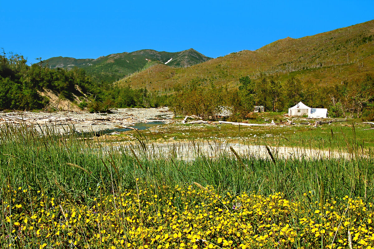 17 июля, р. Секча, где-то на северо-востоке. Здравствуйте все! Вот я и на Секче. Добрался сюда с приключениями. Сначала прилетели на Тас-Юрях и работали на теплице. Через 2 дня полетели на Нёт, где весь день с утра до 9 часов вечера просидели на вертолётной площадке, ждали рейса. Попутно разгружали и загружали вертолёты. В конце концов прилетел наш и повёз нас на Секчу, по пути мы посетили ещё 2 участка. На первом сели и, не выключая двигателя, разгрузили груз, полетели на второй... Летим, летим, начинаем снижаться. Я подумал, что прилетели, ан нет — вертолёт завис над косой на реке и выбросил нас на неё. Стоим мы вчетвером и смотрим на тайгу: вокруг ни души и мы без вещей. Стоим и шутим по поводу медведей: вот выйдет сейчас посмотреть и... всё...
