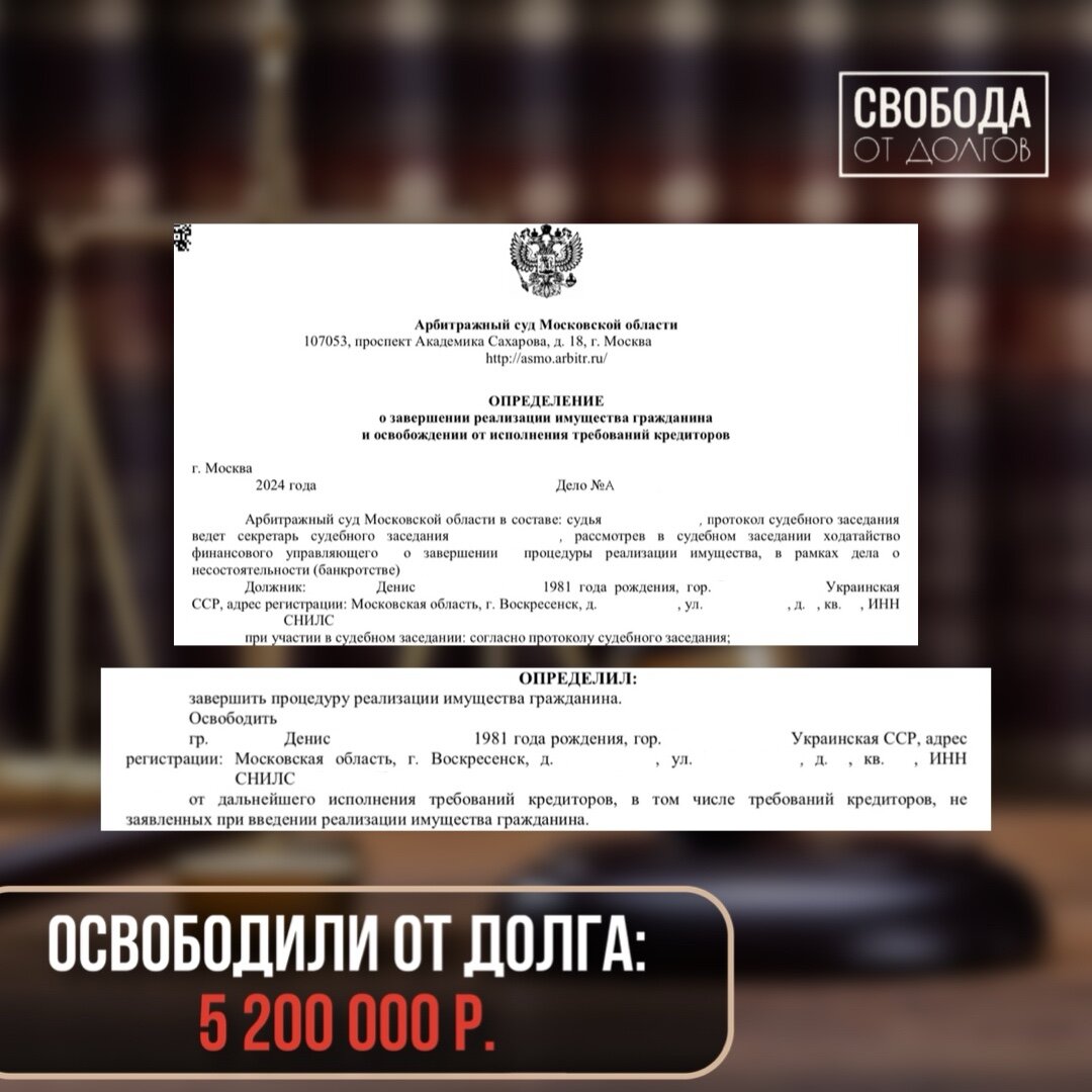 Денис из Московской области. ❗️ Размер списанного долга: 5 200 000 руб. Имущественное положение: ипотечный дом, официального дохода не было. Клиент попал в неприятную ситуацию. Если вы хотите узнать, есть ли у вас шанс на законное списание долгов, пройдите бесплатный ТЕСТ. 💁🏻♂️ Он жил с девушкой, они решили купить дом в ипотеку, который требовал строительства и будущих вложений для ремонта. Девушка его обманула, ушла с деньгами. Денис потерял работу и как дальше оплачивать ипотеку и достраивать дом он не знал. Начал искать пути решения и решил пройти процедуру банкротства. ☝🏻 Судом сразу была введена процедура реализации. Были торги. Дом не сразу купили, но когда нашелся покупатель процедура шла к завершению. Дополнительных документов судом в ходе процедуры запрошено не было. Процедура длилась по времени 16 месяцев по причине, что долго не было желающих купить дом. Итог: ДОЛГИ СПИСАНЫ!👏 💡 Что делать прямо сейчас?