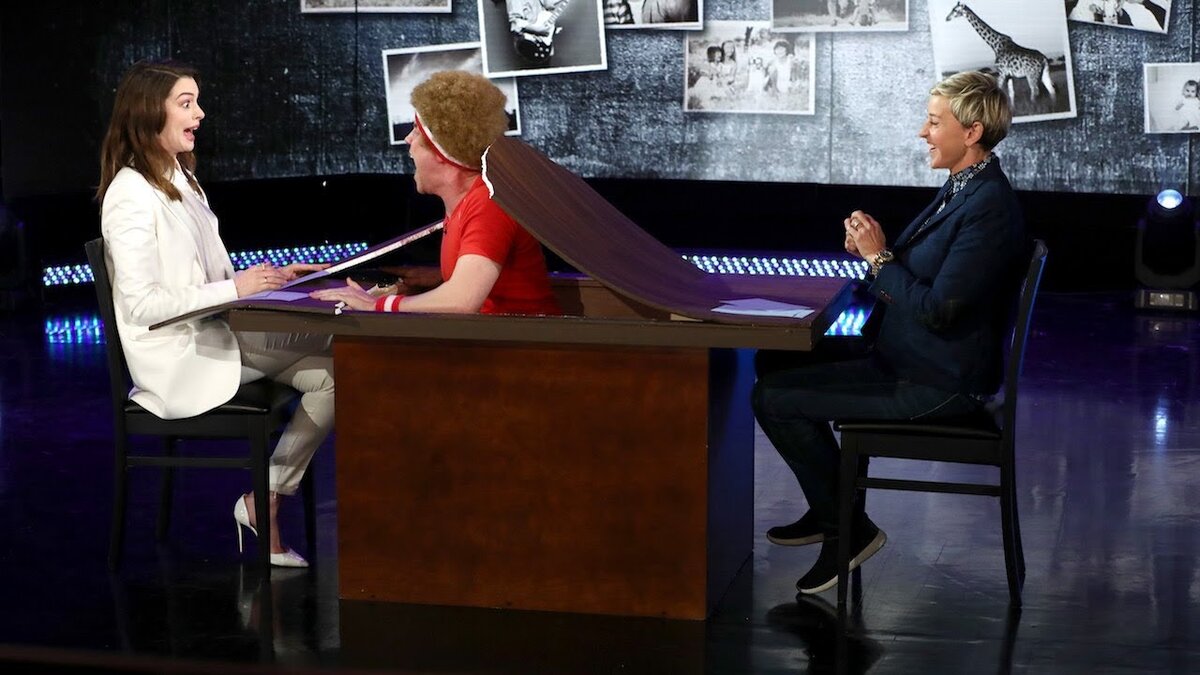 Эллен Дедженерес в своем шоу «Шоу Эллен Дедженерес» взяла чуть ли не традицию пугать своих гостей другими людьми, которые с криком выпрыгивают из неожиданного места. Несколько раз Эллен проворачивала этот трюк с коробкой, которая располагалась рядом с актером, и в определенный момент из нее кто-то выпрыгивал. Но актрисе Энн Хэтэуэй повезло меньше, так как к коробке еще подготовиться можно, а вот, когда на съемочной площадке стоит только один стол, легко потерять бдительность. Посреди разговора Эллен постучала ногой по столу, Энн это заметила, но не поняла, что происходит. Затем Эллен еще раз постучала и в моменте, пробив стол, из него вырвался человек в красном костюме, крикнул на Энн и убежал.